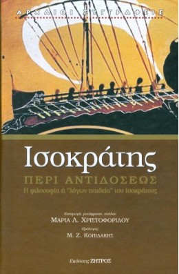 Η ιδέα για τη συγγραφή αυτού του βιβλίου έχει την απαρχή της στην επί μια τετραετία διδασκαλία μου του λόγου Περί Αντιδόσεως στο Τμήμα Φιλοσοφίας-Παιδαγωγικής του Αριστοτέλειου Πανεπιστήμιου Θεσσαλονίκης. Το έργο είχε επιλεχθεί, γιατί πληρούσε τη σκοπούμενη φιλοσοφική και παιδαγωγική διάσταση που ήταν επιθυμητή για τους φοιτητές του τμήματος αυτού, μιας και κατά την ισοκρατική αντίληψη η "λόγων παιδεία", την οποία ήθελε ο ρητοροδιδάσκαλος να μεταλαμπαδεύσει στους μαθητές του, συνέπιπτε με τη φιλοσοφία του. [...]Μετάφραση: Μαρία Χριστοφορίδου