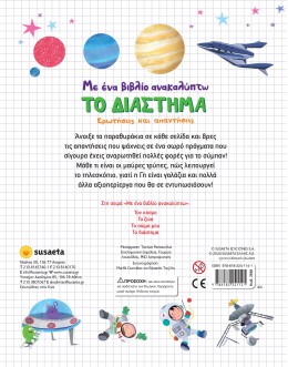 'Ανοιξε τα παραθυράκια σε κάθε σελίδα και βρες τις απαντήσεις που ψάχνεις σε ένα σωρό πράγματα που σίγουρα έχεις αναρωτηθεί για το σύμπαν! Μάθε τι είναι οι μαύρες τρύπες, πώς λειτουργεί το τηλεσκόπιο, γιατί η Γη είναι γαλάζια και πολλά άλλα αξιοπερίεργα που θα σε εντυπωσιάσουν!Εικονογράφηση: Marife Gonzalez & Eduardo Trujillo