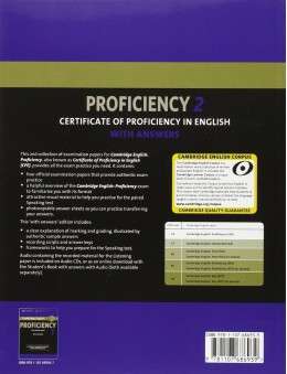 Cambridge English Proficiency 2 contains four complete and authentic examination papers for Cambridge English: Proficiency, also known as Cambridge Certificate of Proficiency in English (CPE). This collection of past examination papers provides the most authentic exam preparation available. They allow candidates to familiarise themselves with the content and format of the examination and to practise useful examination techniques. This book contains a clear explanation of marking and grading, authentic sample answers, a comprehensive section of keys and recording scripts, and frameworks to help with thorough preparation for the Speaking test. Audio CDs containing the exam Listening material, a Student's Book without answers, and a Student's Book with answers with downloadable Audio are available separately.