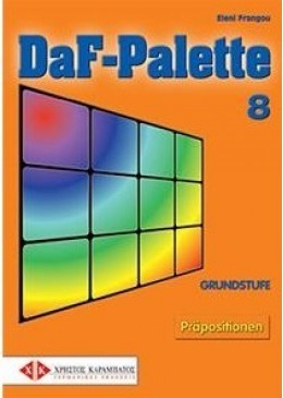 Η Daf-Palette 8 συνοδεύει τους μαθητές των επιπέδων Α1, Α2 και Β1 και μπορεί επίσης να χρησιμοποιηθεί αργότερα για επανάληψη. Οι προθέσεις παρουσιάζονται χωρισμένες σε κατηγορίες και πλαισιώνονται από λεπτομερείς εξηγήσεις στα ελληνικά για τη σωστή χρήση τους καθώς και πολλά παραδείγματα που διευκολύνουν την κατανόηση. 72 ασκήσεις διαβαθμισμένης δυσκολίας εξασφαλίζουν την εμπέδωση.