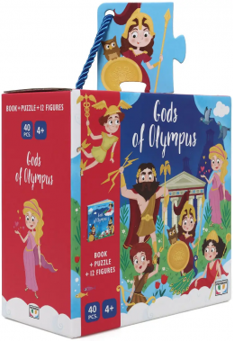 This box contains a book, a puzzle, and 12 figures. The book introduces readers to the 12 gods of Olympus and cultivates early reading skills. The puzzle can be assembled by children